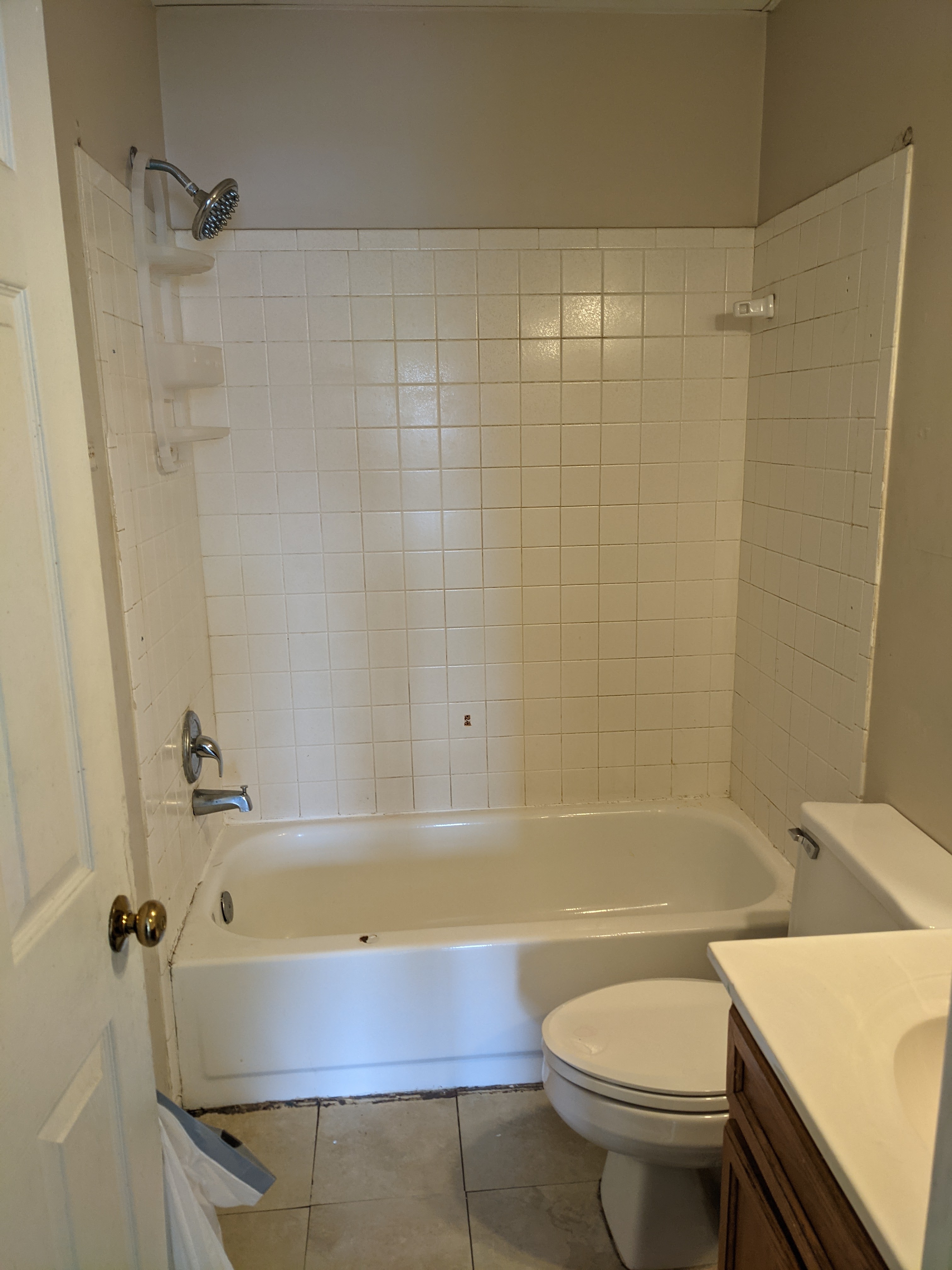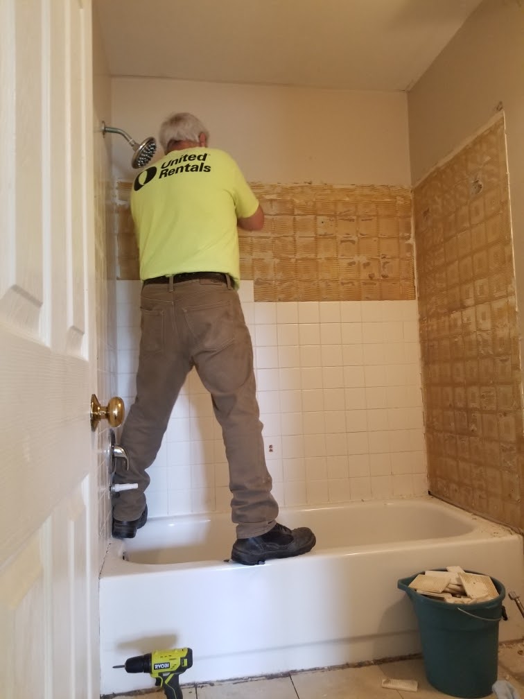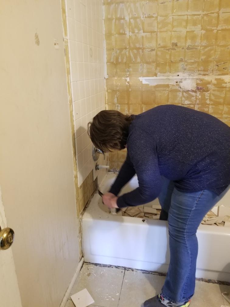 When I made the decision to refinance the house to my own name instead of selling it, I was determined that renovating my girls’ bathroom would be the first project I would tackle. That is, after I redid my bedroom to make it MINE. It took a few months to get started on the project, I knew what I wanted to do in my mind, but getting moving on it was overwhelming. I had to get my own shower fixed first so that we still had a working one. Once that was done, there was nothing holding me back, other than my intimidation. I knew that I wanted to do the bulk of the work myself, not using a handyman. Do I have any experience? Nope. Do I know what I’m doing? Nope. But I knew that YouTube, my dad and friends would get me through most of it.