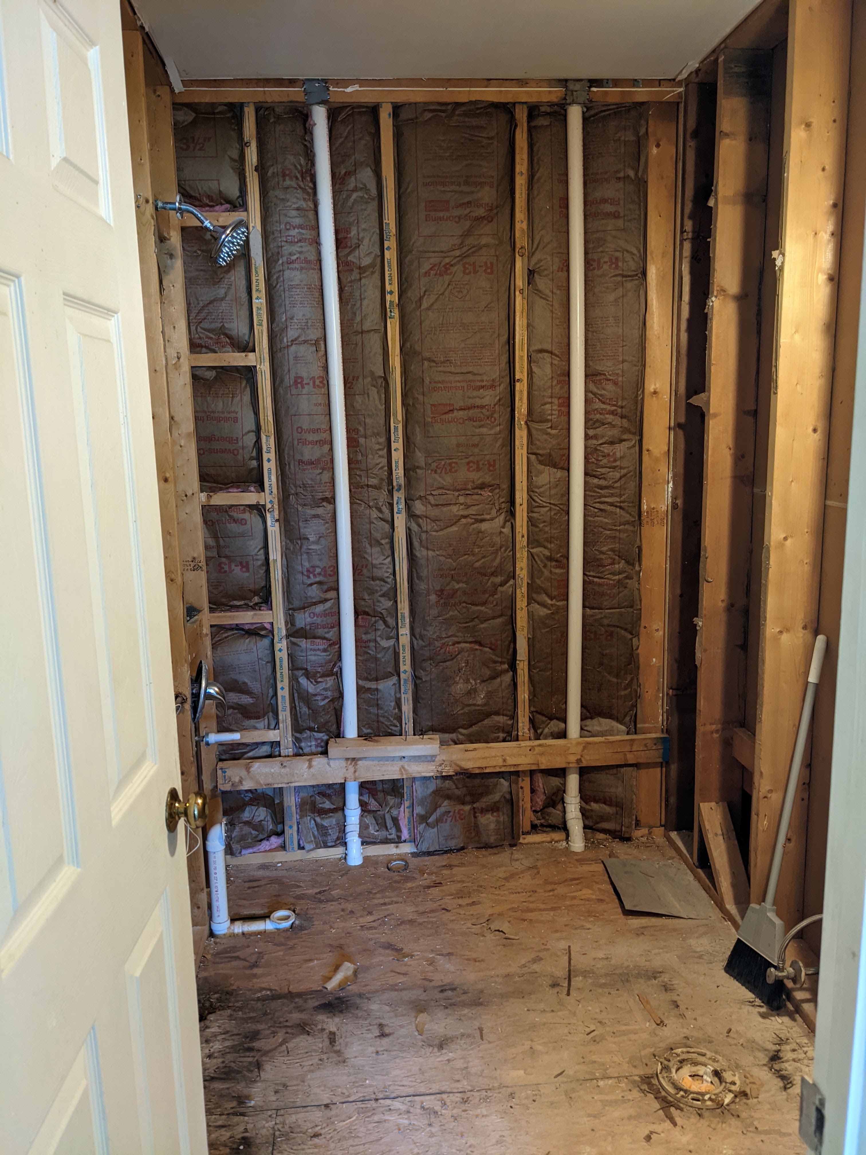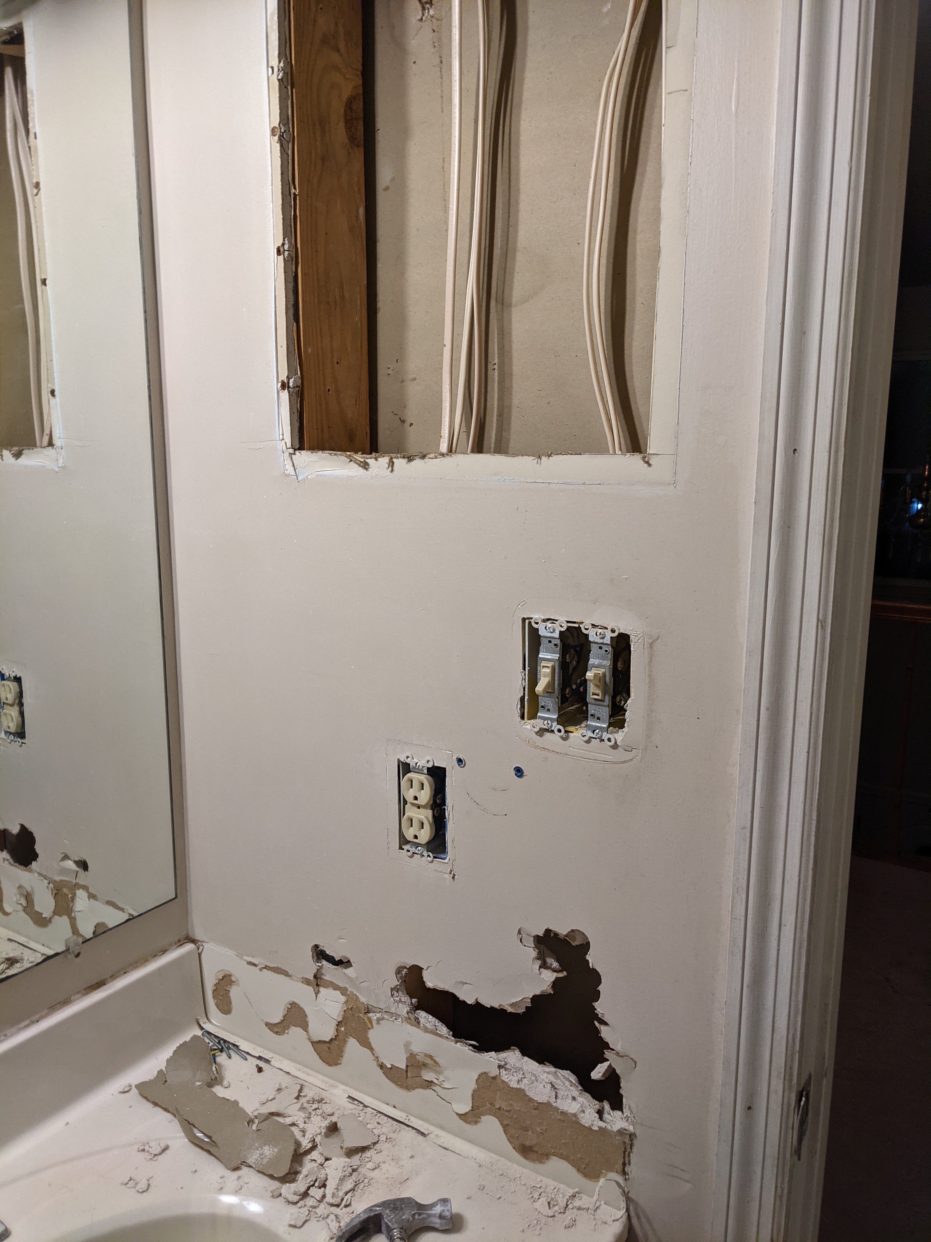 One weekend when the girls were with their dad, I decided to start. I cleared everything out of the room, unscrewed the light switch cover and removed the medicine cabinet, using my OWN power tools! I knocked a hole in the drywall (which was way too much fun). Then, I put off the project for a while. At that point, I was afraid I bit off more than I could chew. Taking the room down to the studs and subflooring was crazy, right?