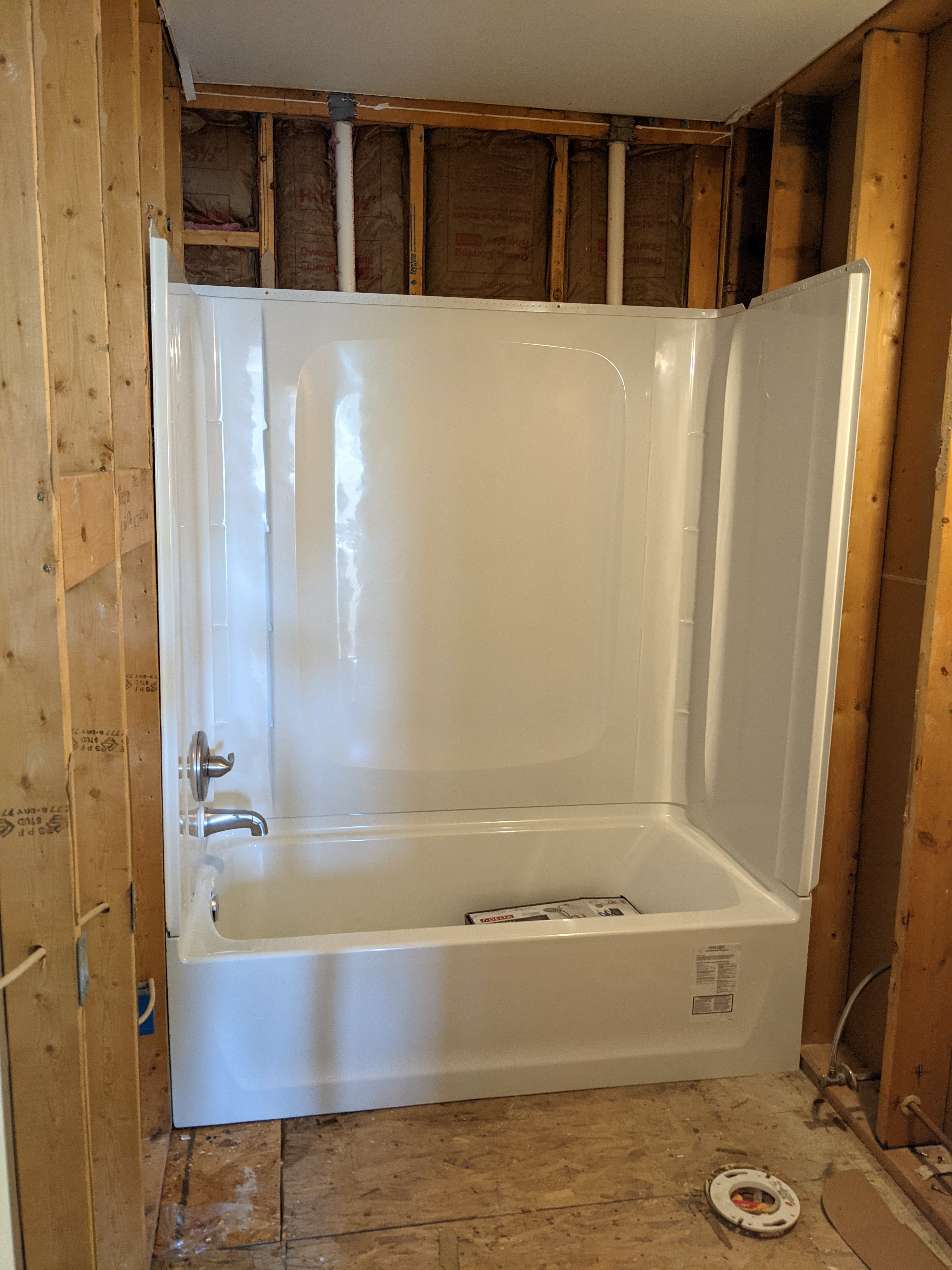 I purchased the tub and shower surround from Home Depot. I had been looking around for months (even before the renovation started) for what I wanted and pricing out the options. I knew I didn’t want just a tub and titled walls, I wanted shelves and something easier to clean, with less chances for water to get into the walls. I found the Sterling Store+ set and knew it was what I wanted. I loved that I could customize the shelving with a 10 or 12 piece set, which was perfect so each girl has their own set of shelves. It installed directly to the studs, which made installation easy and I didn’t have to worry about making sure drywall was set up properly behind it.