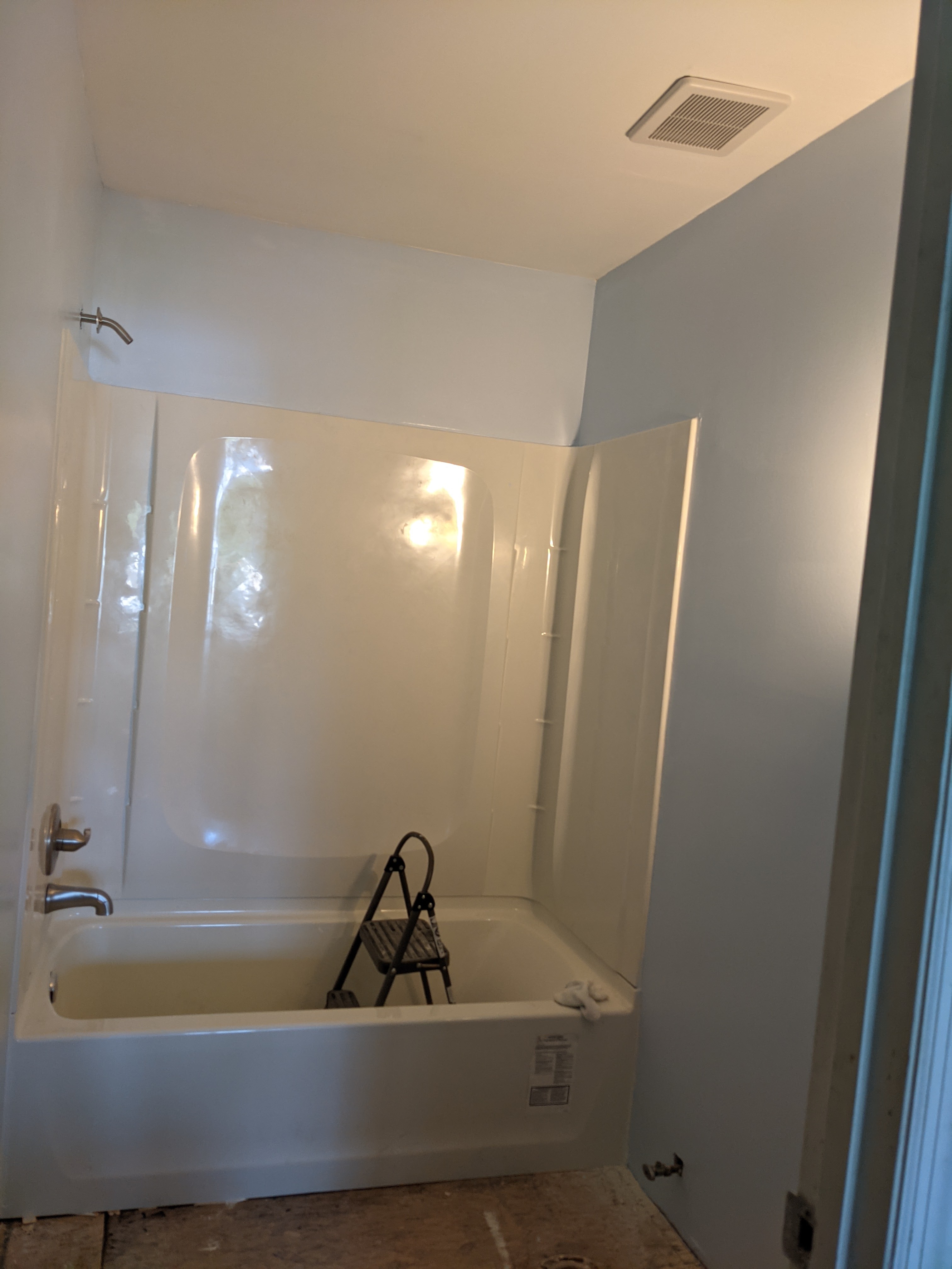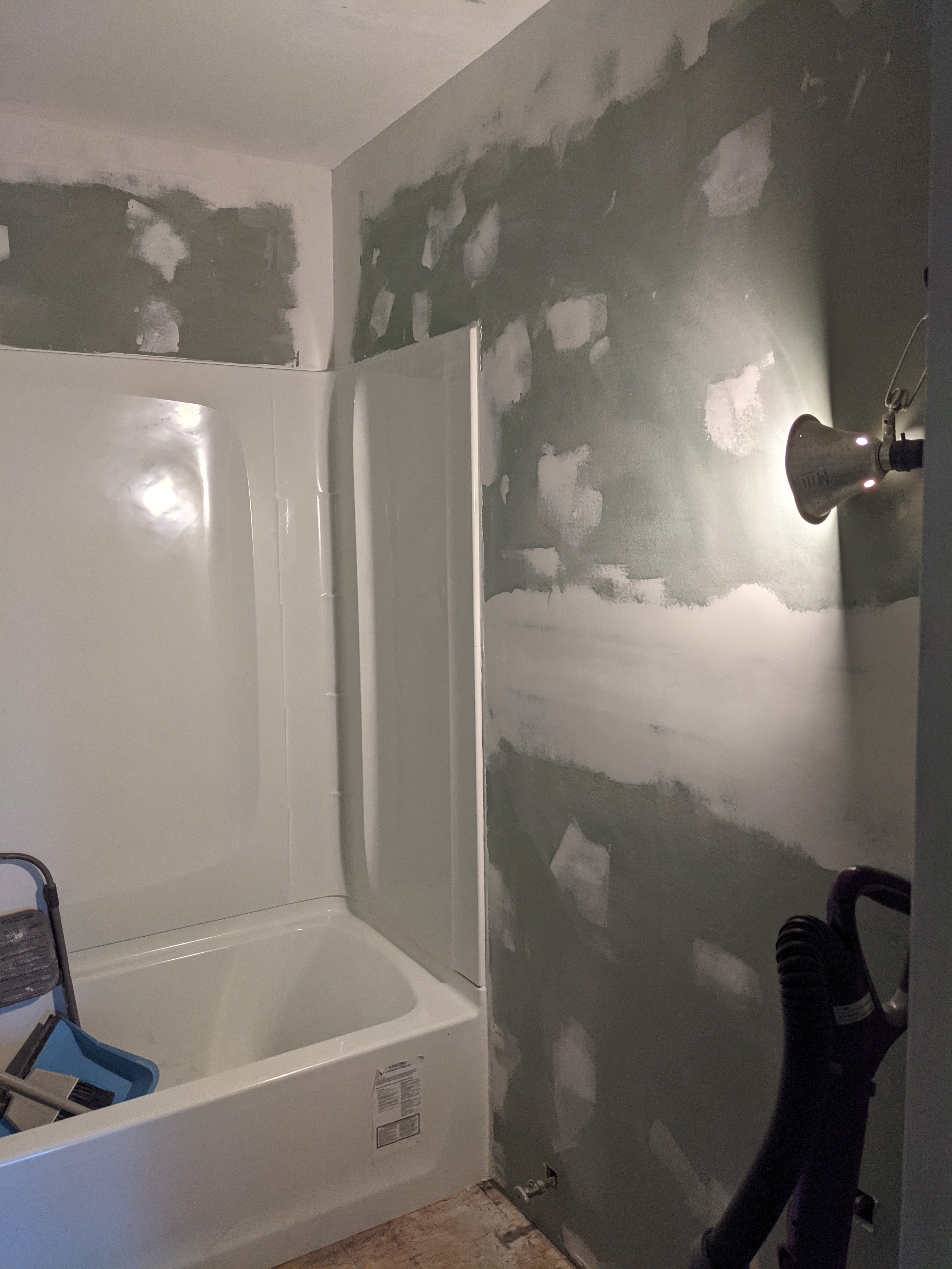 After the tub and surround were in, Dad came over one day while I was working (he was just as anxious to get it all done before my surgery as I was) and measured, cut and put up the drywall. At this point, we discovered the room was VERY much not square, but it wasn’t anything we wouldn’t be able to remedy with lots of taping and filling. I chose mold and mildew resistant drywall for the entire room as I was worried about the chance of mold reoccurring. Dad left the mudding and taping to me, mainly because I was determined to figure it all out myself. I spent lots of time YouTubing how to do it and one morning I woke up and got to work. I chose to use an all-purpose drywall mud and mesh tape since it was inevitably going to be a moist environment and the mesh was recommended over paper tape. I cussed a lot during this process, as my perfectionist tendencies kept trying to come out to make sure things were square and neat. Plus being only 5’3” reaching the ceiling over the tub was challenging. Some areas needed thick mud due to the unevenness of the room, which increased the drying time.
